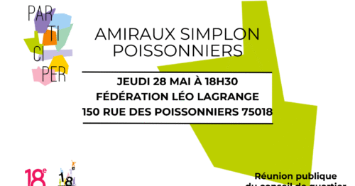 Le conseil de quartier Amiraux Simplon – Poissonniers est de retour le Jeudi 28 mai à 18h30 à la Fédération Léo Lagrange, 150 rue des poissonniers 75018. Au plaisir de vous y retrouver ! Le service démocratie locale.
